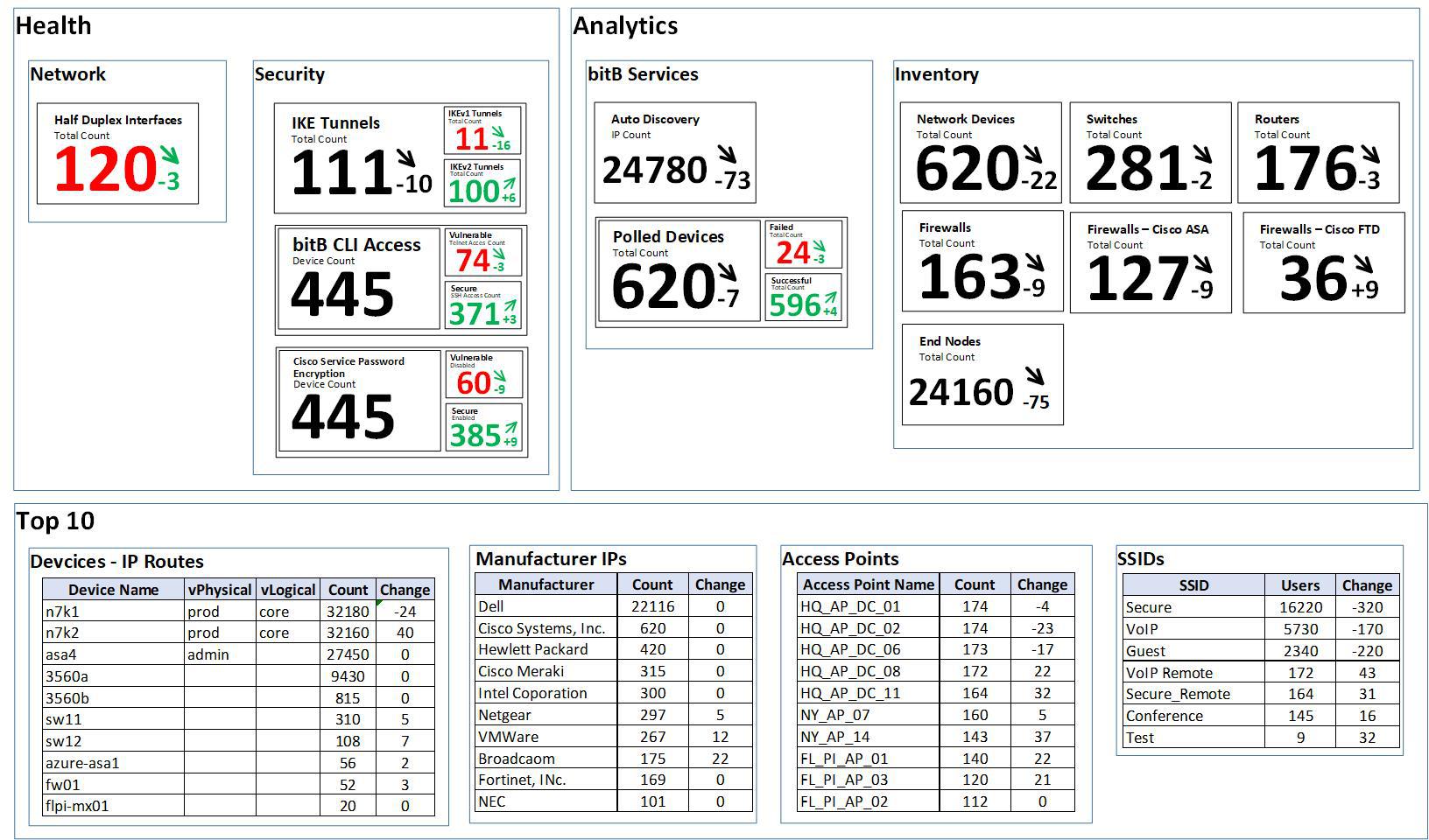 - the bitB Insight Dashboard, which monitors the health and security configurations of network devices from a single, easy-to-customize dashboard.